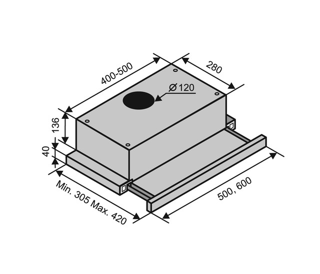Широку популярність серед побутових кухонних втягувань у нашій країні здобули вбудовані витяжки телескопічного (розсувного) типу. Кухонні висувні витяжки GARDA 60 BK (450) від компанії VENTOLUX належать до такого класу та виготовлені з емальованої сталі в чорному кольорі. Витяжка телескопічна для кухні коричневого кольору VENTOLUX GARDA 60 BK (450) має ширину 60 см , а максимальна потужність всмоктування повітря становить 450 м3/год. Витяжки кухонні з висувною панеллю призначені для вбудовування в кухонні шафки та можуть працювати як на відведення повітря у вентиляційний канал, так і на рециркуляцію повітря. Витяжки VENTOLUX GARDA 60 мають широку колірну гаму вироблення і чудово підходять для невеликих або компактних кухонь, даючи змогу максимально використовувати робочий простір.