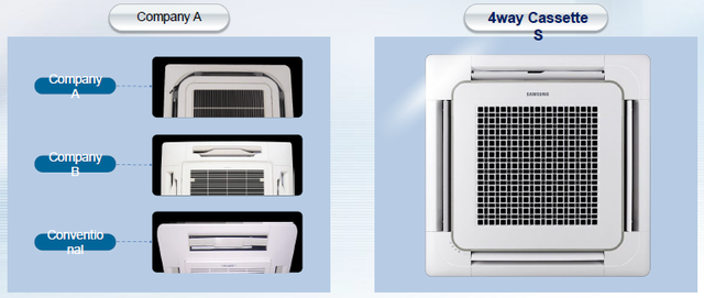 - Компанія Samsung постійно оптимізує та вдосконалює конструкцію внутрішніх блоків для своїх інверторних кондиціонерів. Так корпорація Samsung стала першою компанією, яка випустила на кондиціонерному ринку касетний блок на 35% менше, легший і компактніший, порівнюючи з конкурентами. Внутрішні 4-стельові касетні блоки до кондиціонерів Samsung ECO набагато легше монтувати й обслуговувати.