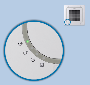 - Внутрішній блок касетний спліт системи Samsung серії ECO має закруглені кути, зелену підсвітку, а також простий і зрозумілий користувачеві інтерфейс