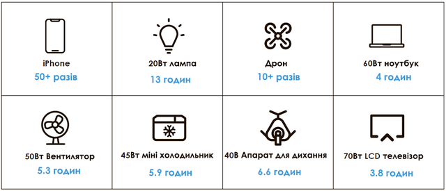 Орієнтовна кількість зарядів і часу роботи різних пристроїв під час використання мобільної зарядної станції ALTEK PowerBox AL 300: